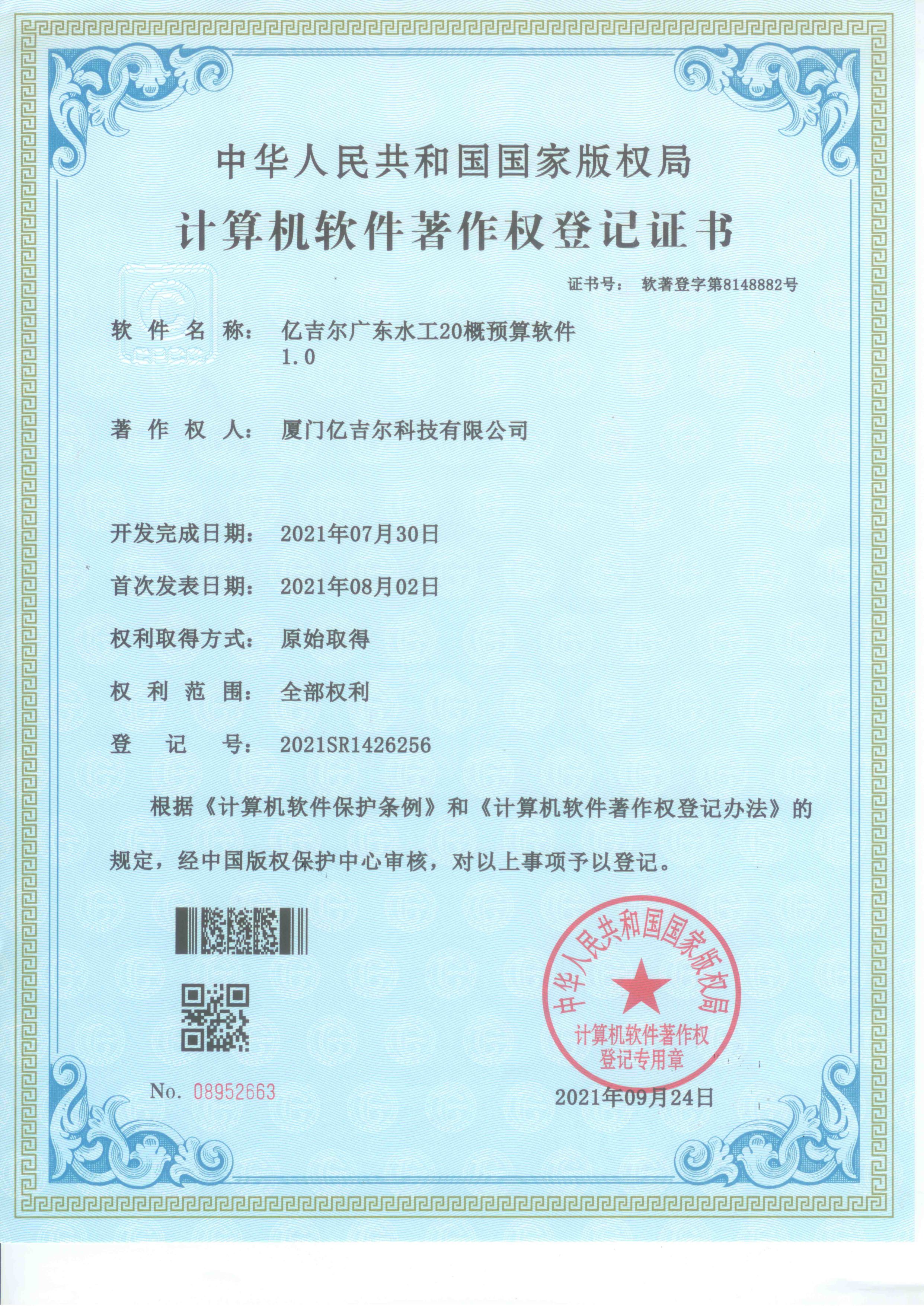 億吉爾廣東水工20概預(yù)算軟件著作權(quán)登記證書 發(fā)布日期:2023年11月22日 瀏覽次數(shù):2026 關(guān)鍵字: 公司 1/1億吉爾廣東水工20概預(yù)算軟件著作權(quán)登記證書_1