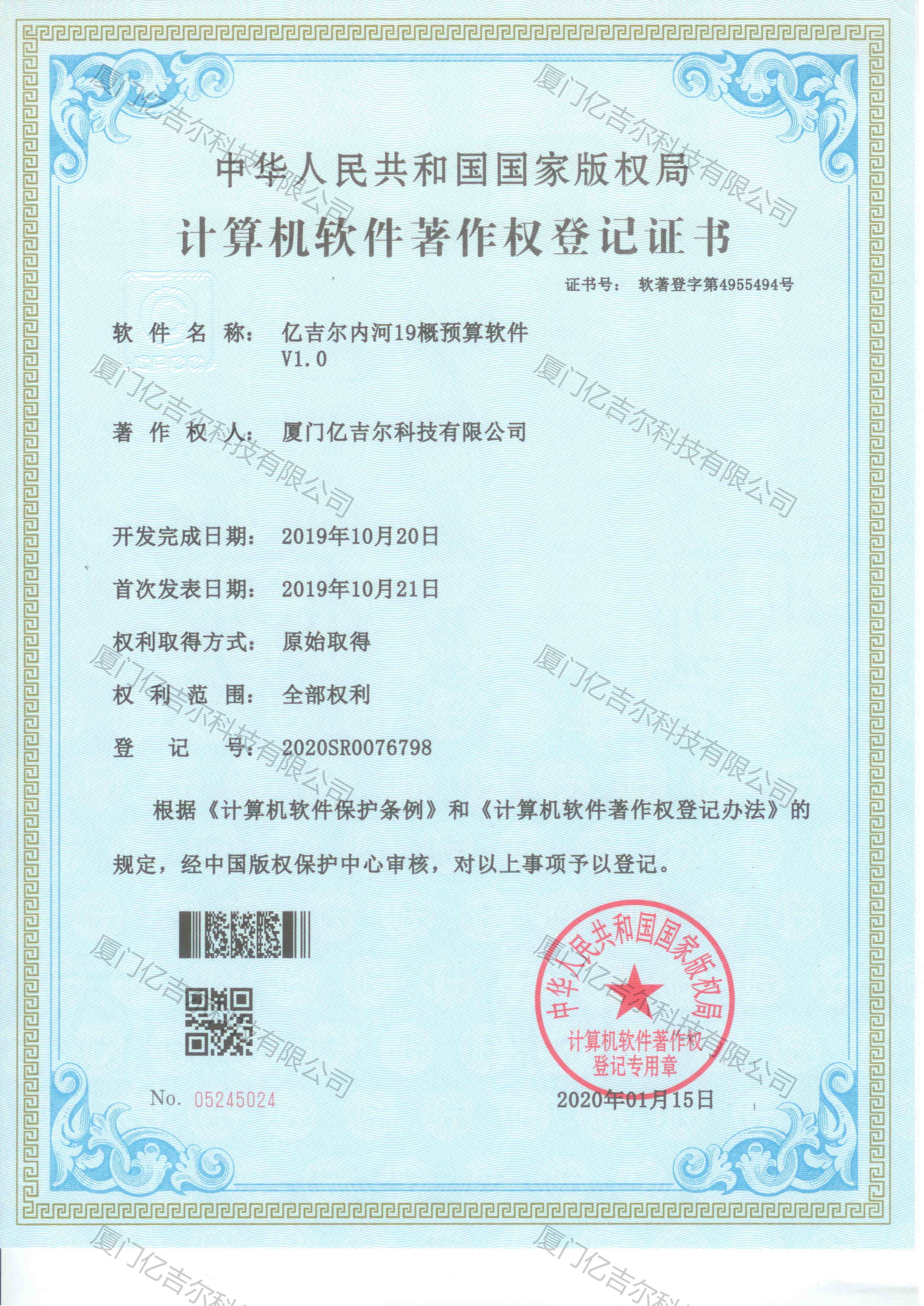 億吉爾內(nèi)河19概預(yù)算軟件著作權(quán)登記證書 發(fā)布日期:2020年01月15日 瀏覽次數(shù):3834 關(guān)鍵字: 公司 1/1億吉爾內(nèi)河19概預(yù)算軟件著作權(quán)登記證書