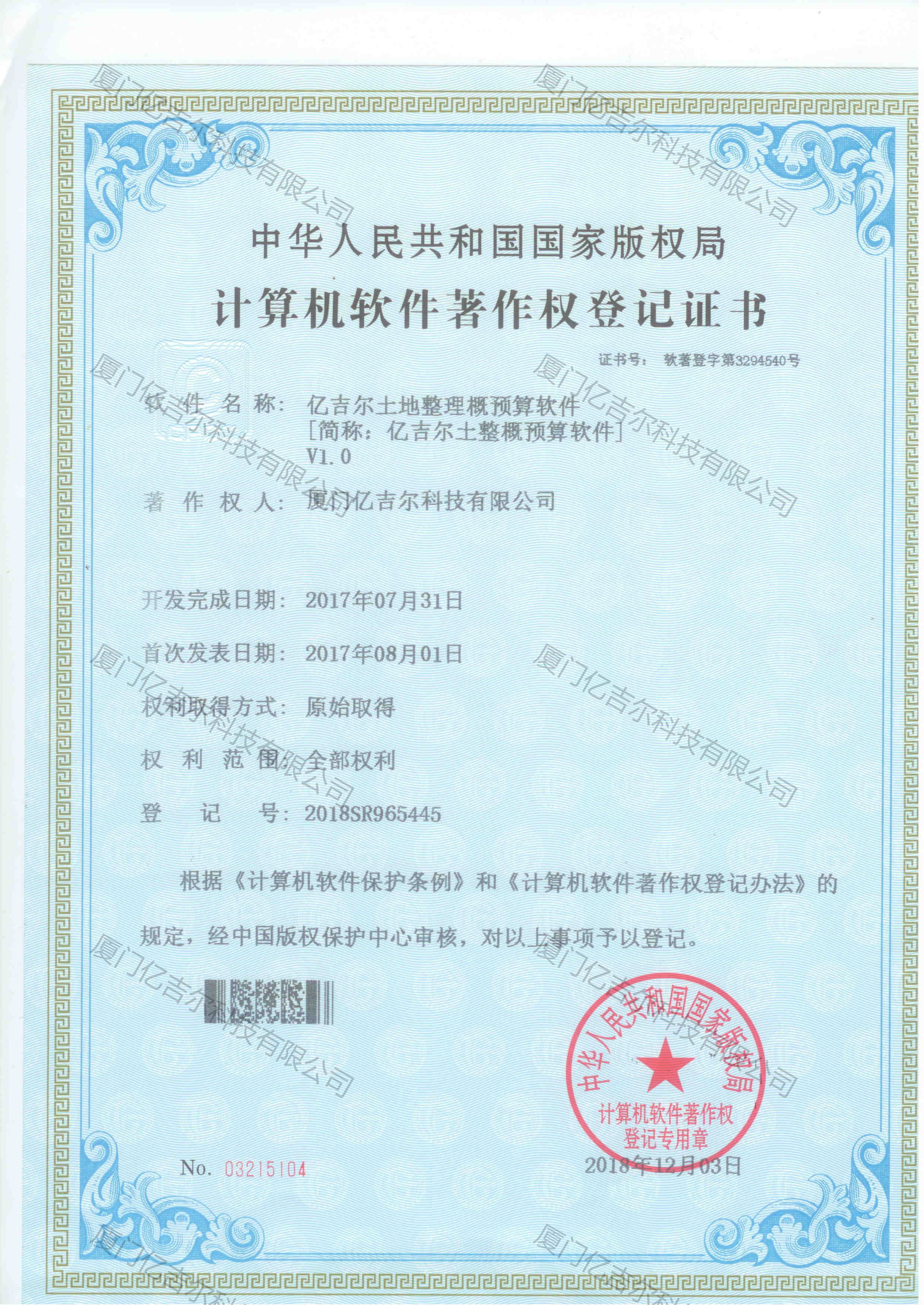 億吉爾土地整理概預(yù)算軟件著作權(quán)登記證書 發(fā)布日期:2018年12月03日 瀏覽次數(shù):3709 關(guān)鍵字: 公司 1/1億吉爾土地整理概預(yù)算軟件著作權(quán)登記證書